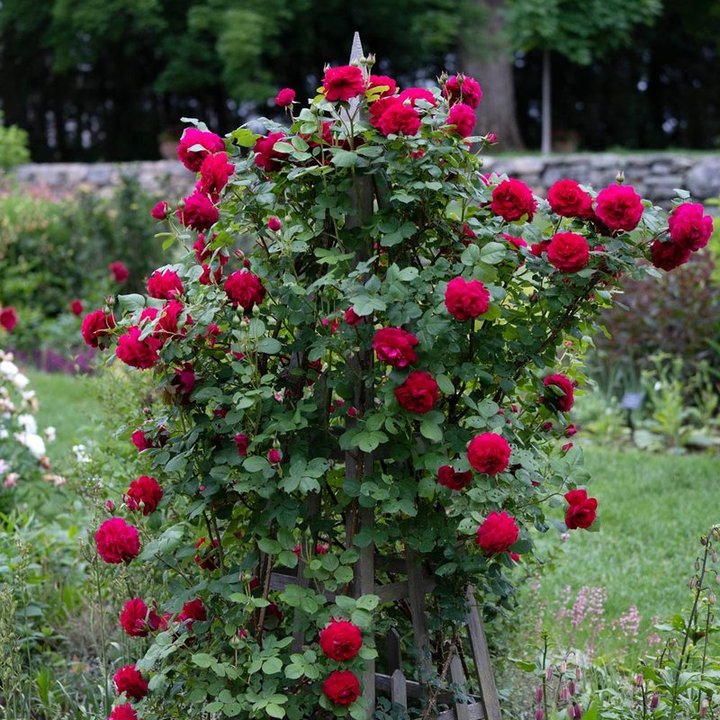 Восхитительная роза с крупными, густомахровыми, ярко-малиновыми цветами.
